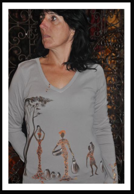 Mes créations sont en perpétuelle évolution , aussi n'hésitez pas à me contacter. Tous mes tee shirt ne figurent pas sur ces pages , et j'ai sûrement dans mes tiroirs celui dont vous rêvez. De plus si je ne l'ai pas, je vous le fabrique selon vos désirs -taille , modèle, couleur- et cela sans supplément. Alors à très vite! TEE SHIRT " VOYAGE AUTOUR DU MONDE " Rêve d'Afrique Taille 38/40 Taille 42/44