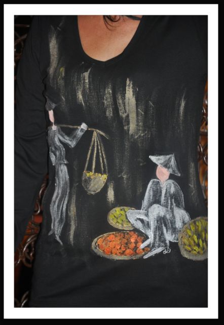 Mes créations sont en perpétuelle évolution , aussi n'hésitez pas à me contacter. Tous mes tee shirt ne figurent pas sur ces pages , et j'ai sûrement dans mes tiroirs celui dont vous rêvez. De plus si je ne l'ai pas, je vous le fabrique selon vos désirs -taille , modèle, couleur- et cela sans supplément. Alors à très vite! TEE SHIRT VIETNAM Manches longues , Taille 38/40 et 42/44